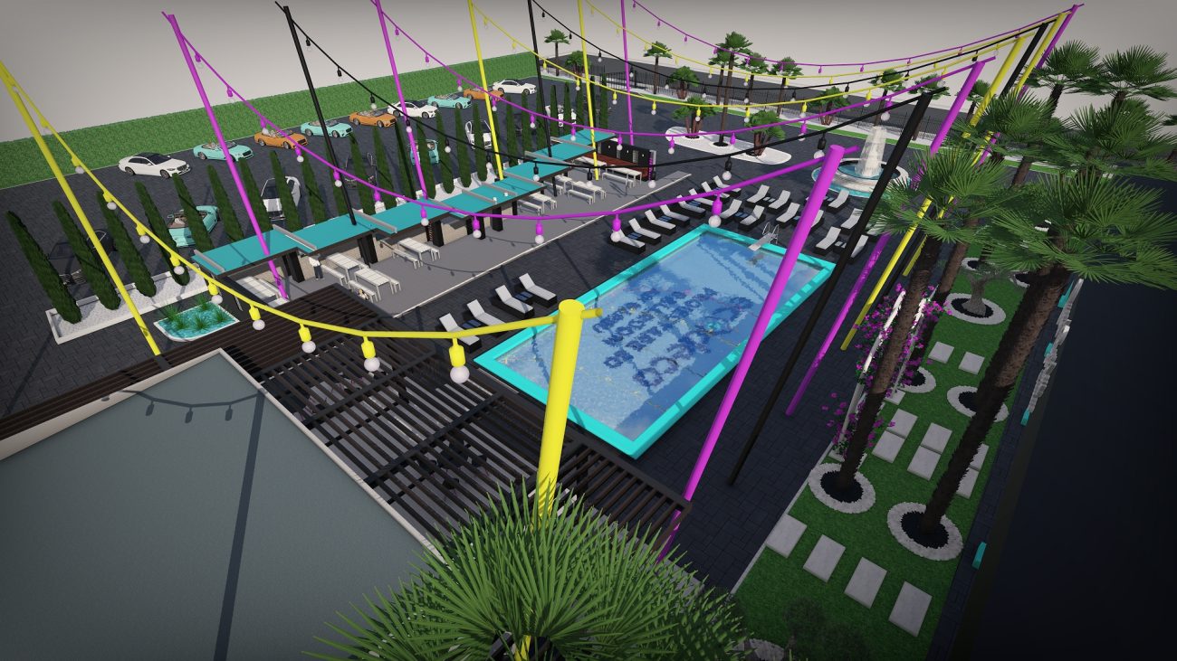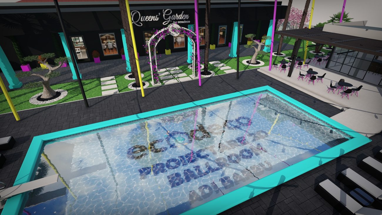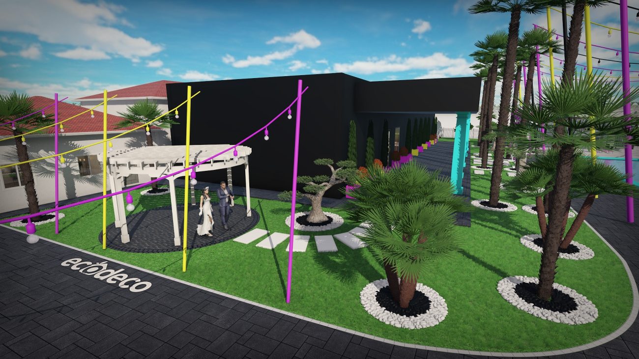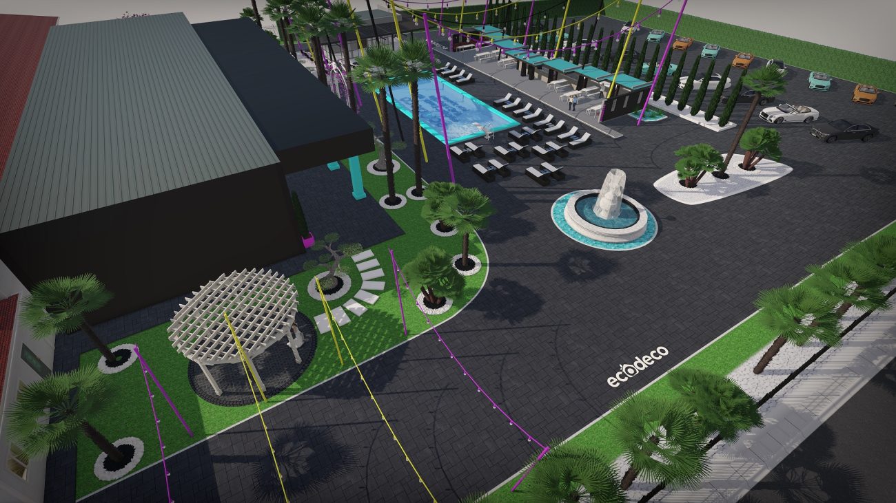 Dintr-un punct pe hartă, am transformat întregul spațiu într-un design 3D complet, cu palmieri, iluminat, texturi exacte și structură vizuală premium.