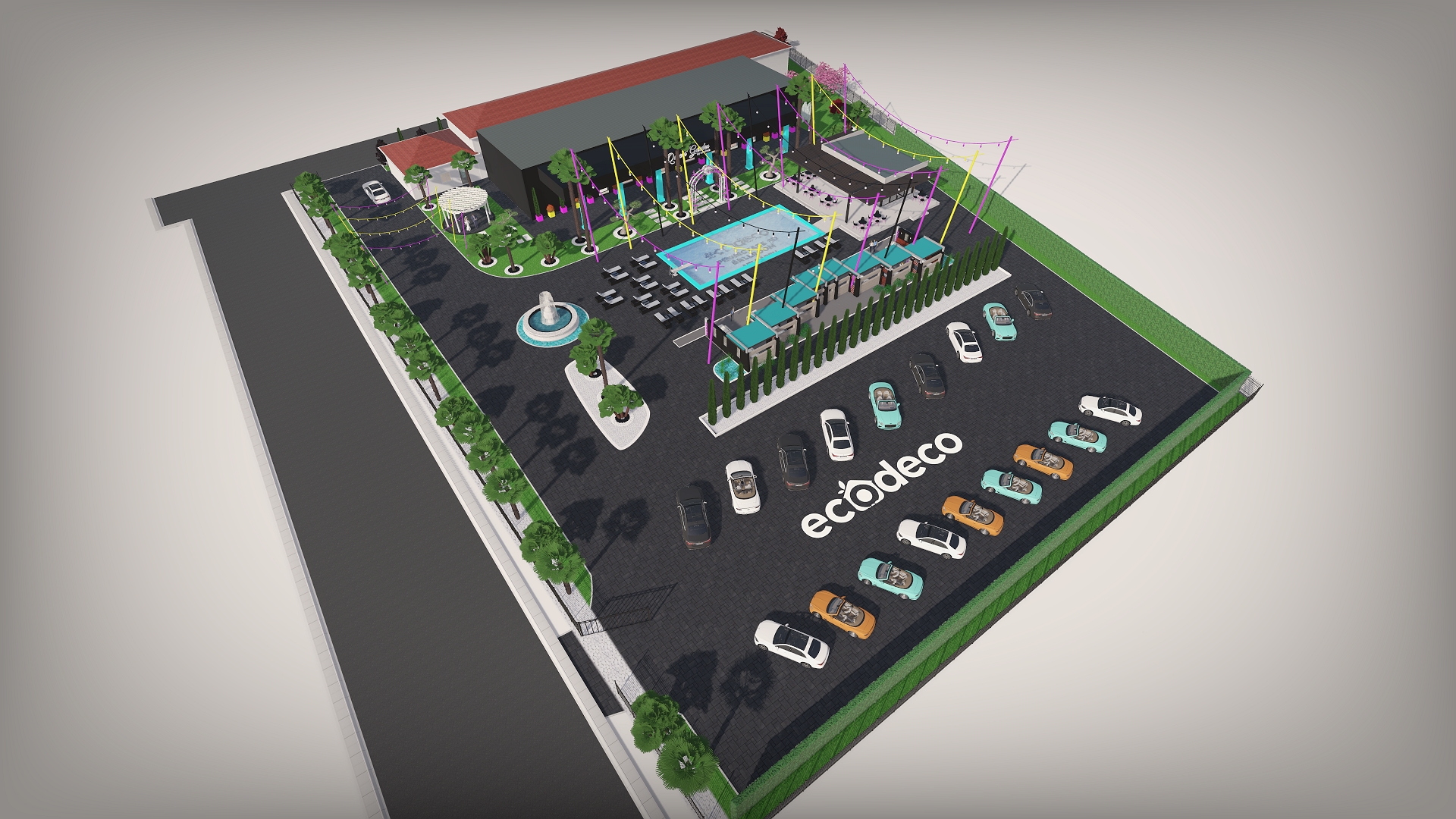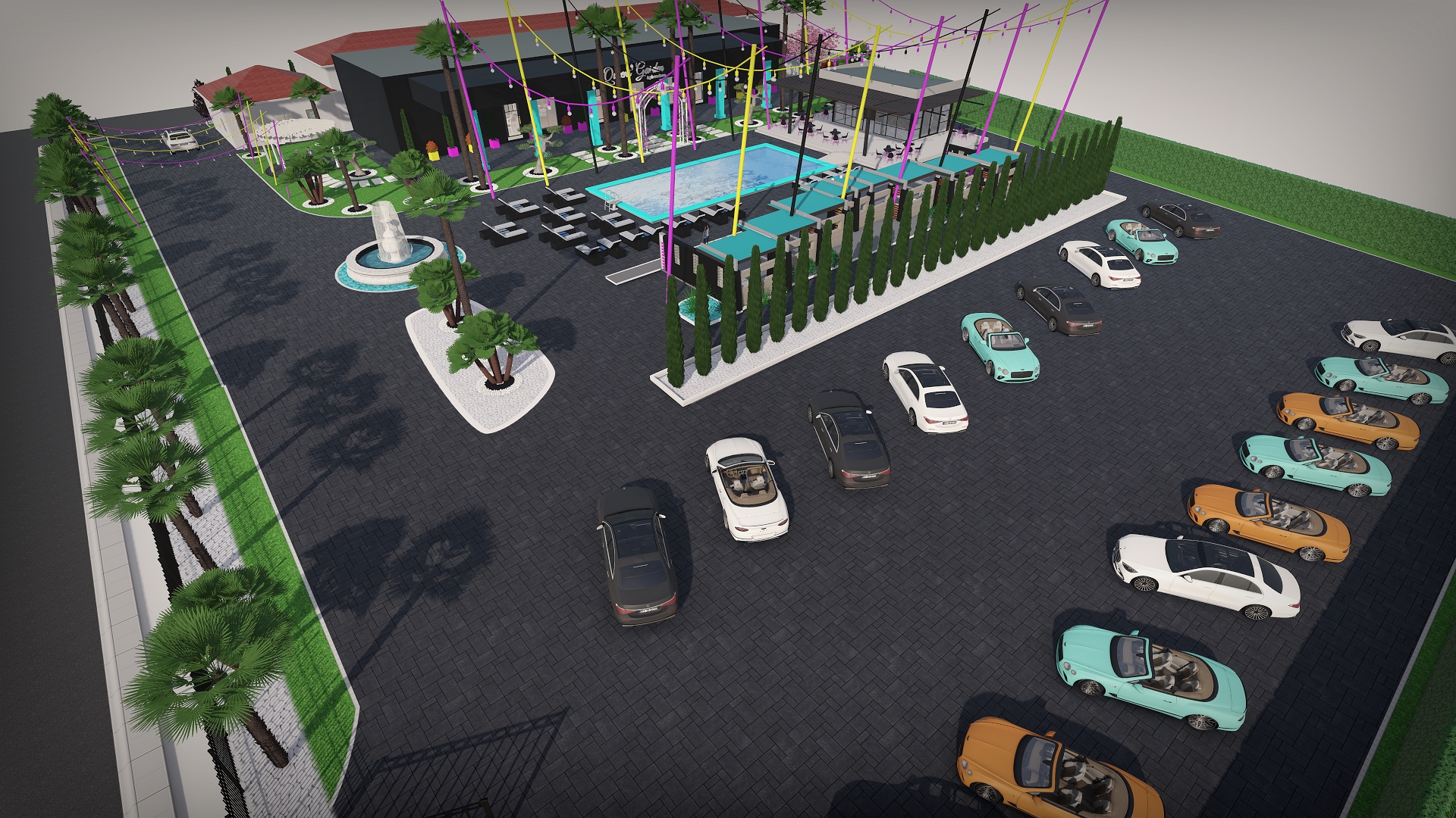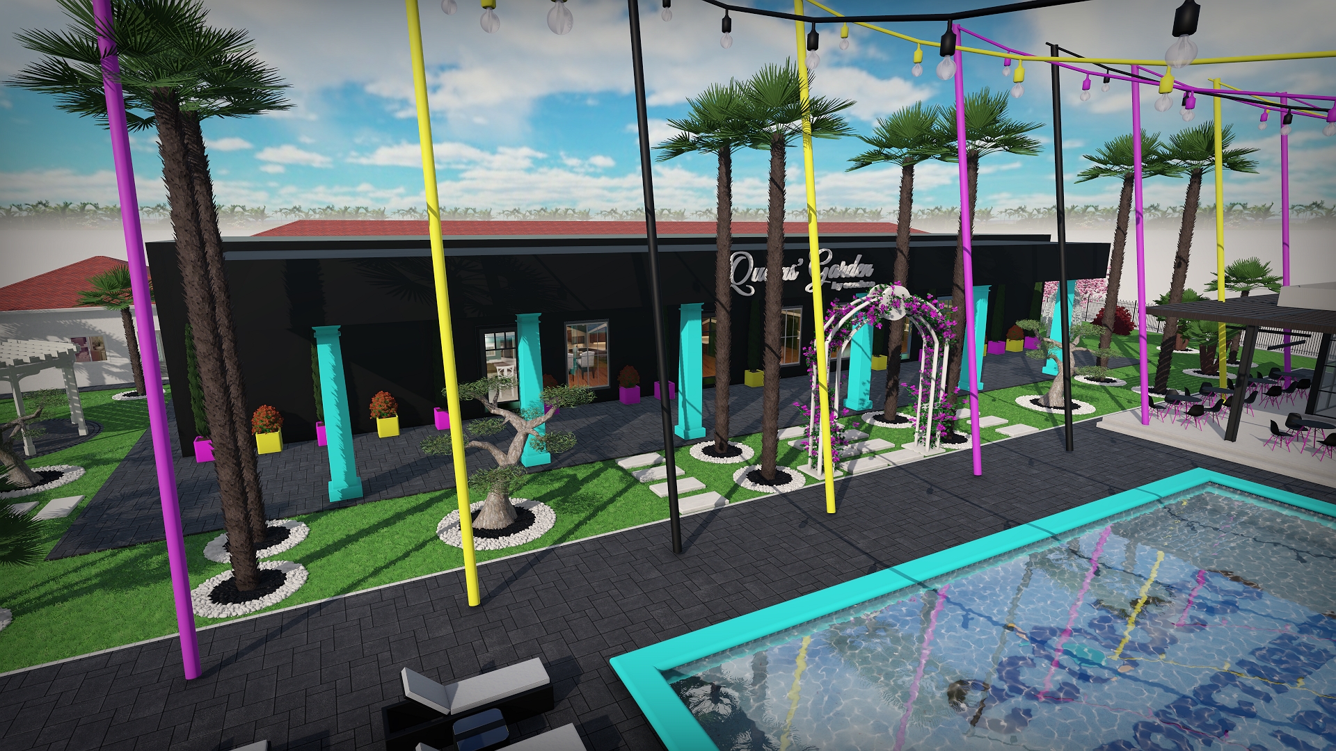 Dintr-un punct pe hartă, am transformat întregul spațiu într-un design 3D complet, cu palmieri, iluminat, texturi exacte și structură vizuală premium.