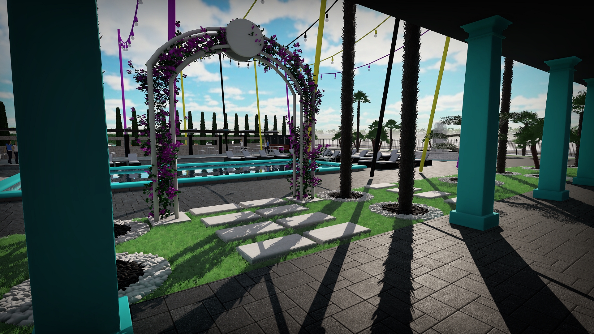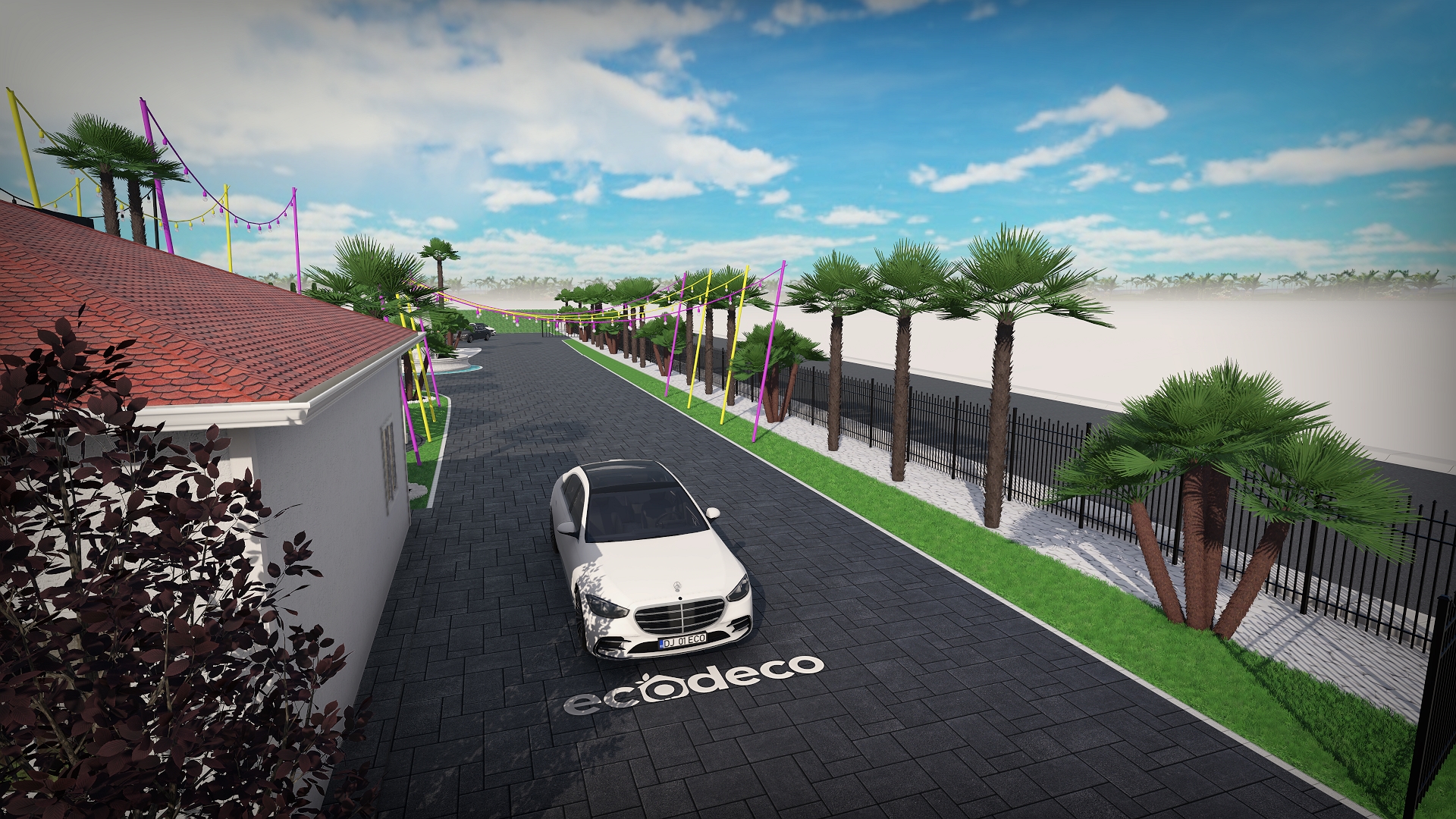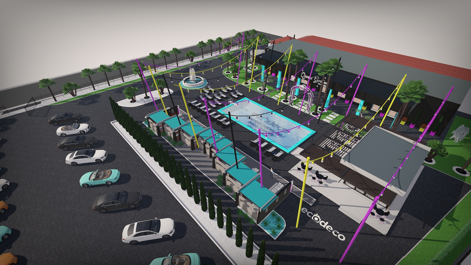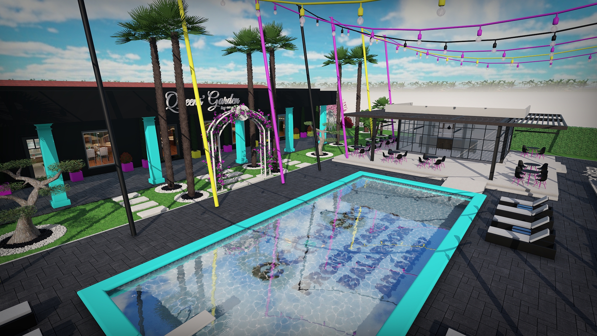 Dintr-un punct pe hartă, am transformat întregul spațiu într-un design 3D complet, cu palmieri, iluminat, texturi exacte și structură vizuală premium.